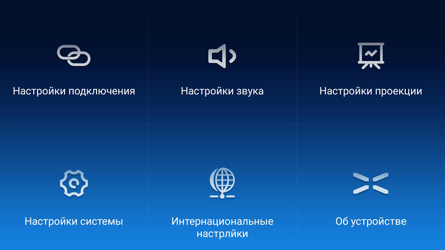 Проектор работает под управлением операционной системы Android 5.1. При первом включении проектор показывает нерезкое изображение, через некоторое время начинается автоматическое изменение резкости, и на английском языке даются советы по настройке проектора. Поднесите пульт (должен быть заряжен) к проектору на расстояние не больше 10 см. Нажмите одновременно кнопки «Домой» и «Шаг назад» - индикатор на пульте замигает зеленым цветом. Дождитесь пока индикатор начнет мигать синим. Нажмите кнопку «ОК». Автоматическое изменение резкости прекратится. Передвинет переключатель на пульте вправо и кнопками регулировки громкости настройте резкость проектора. Вам будет предложено несколько пунктов начальной установки - подключение WlFi , настройка времени и языка. После этого проектор показывает начальный экран: